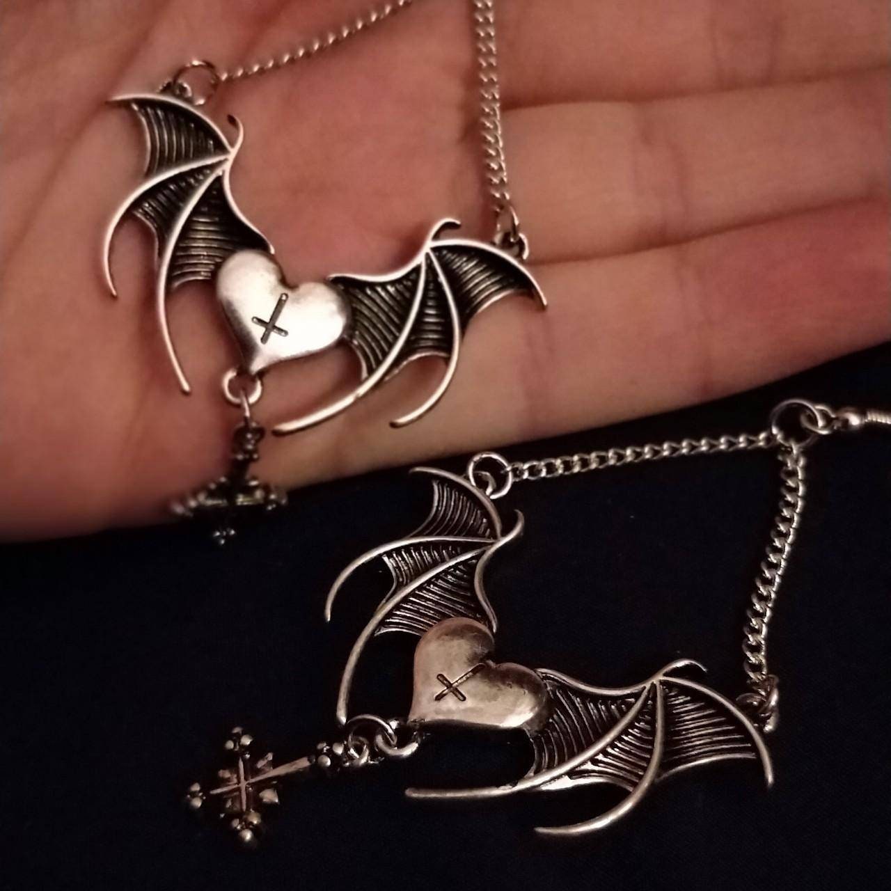 Inverted Crucifix engraved on a Bat Wing heart, with a hanging inverted crucifix ,