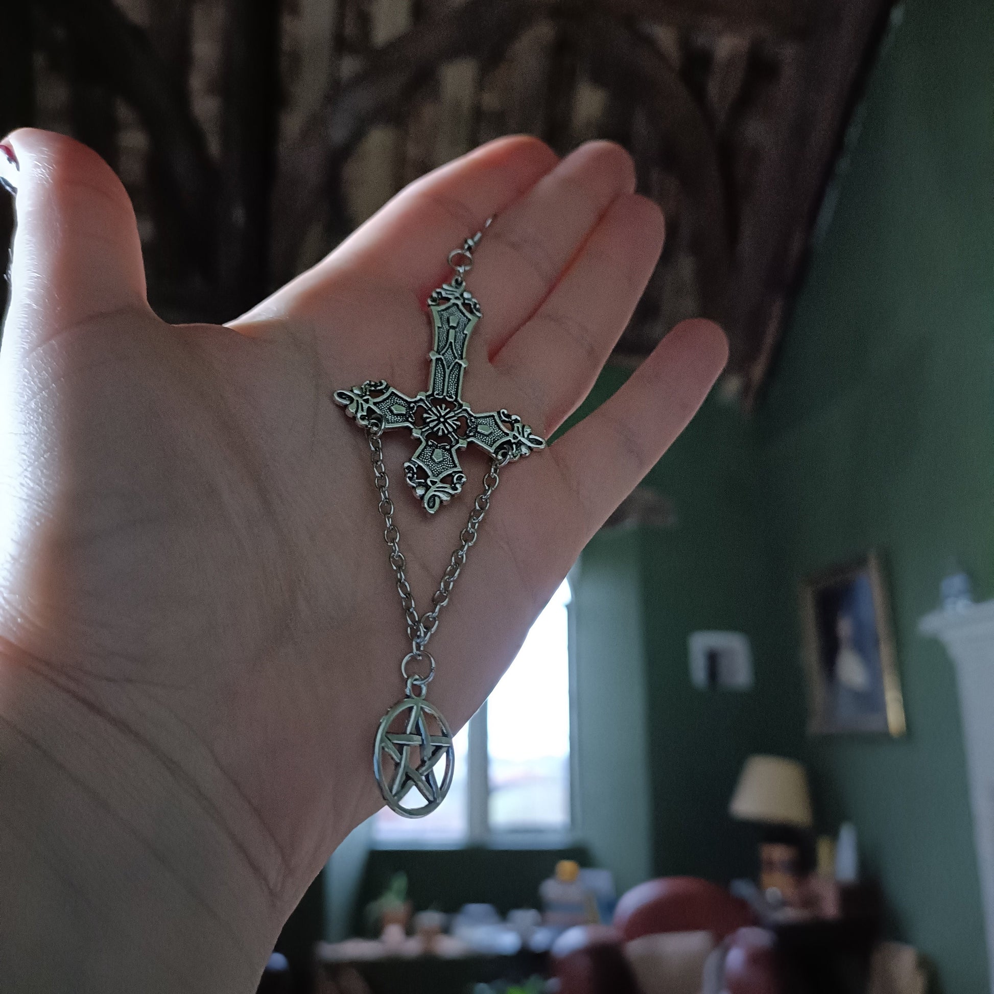 inverted crucifix with a pentagram hanging from chain