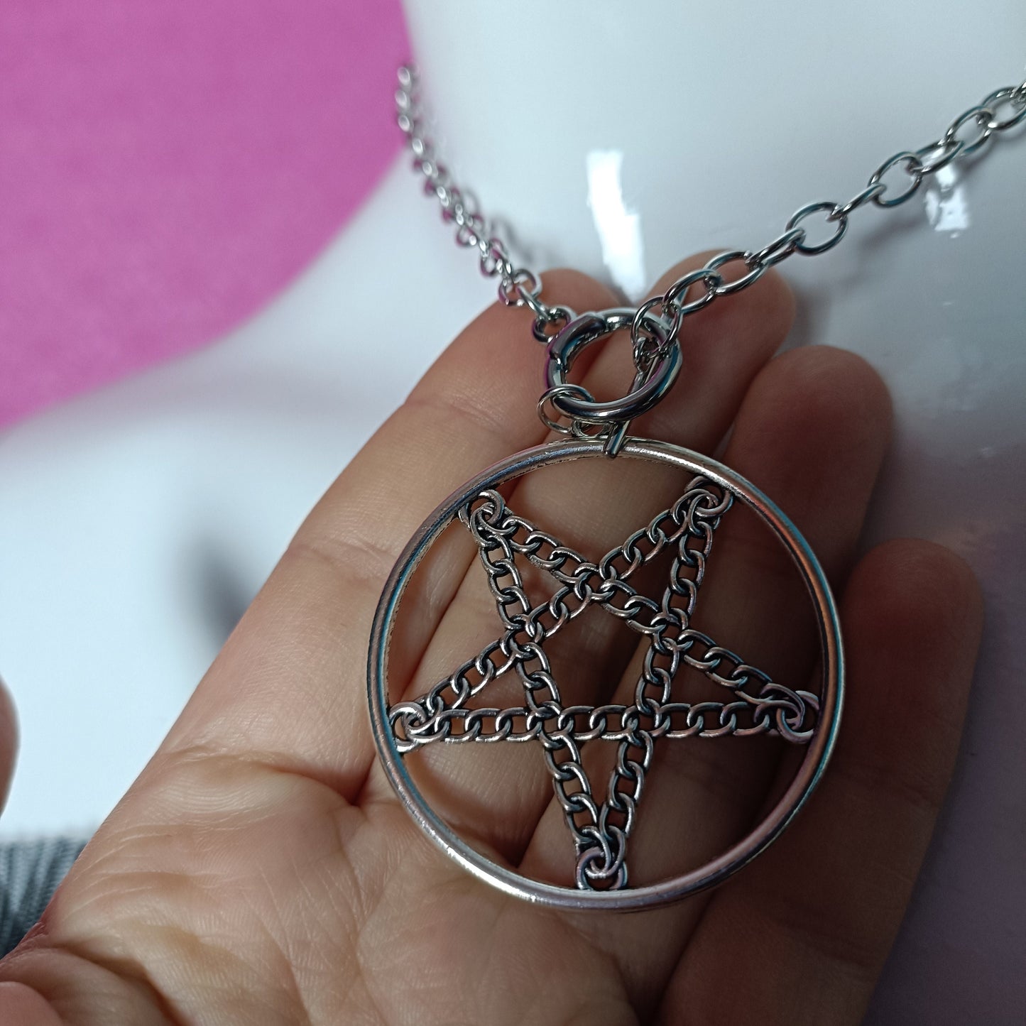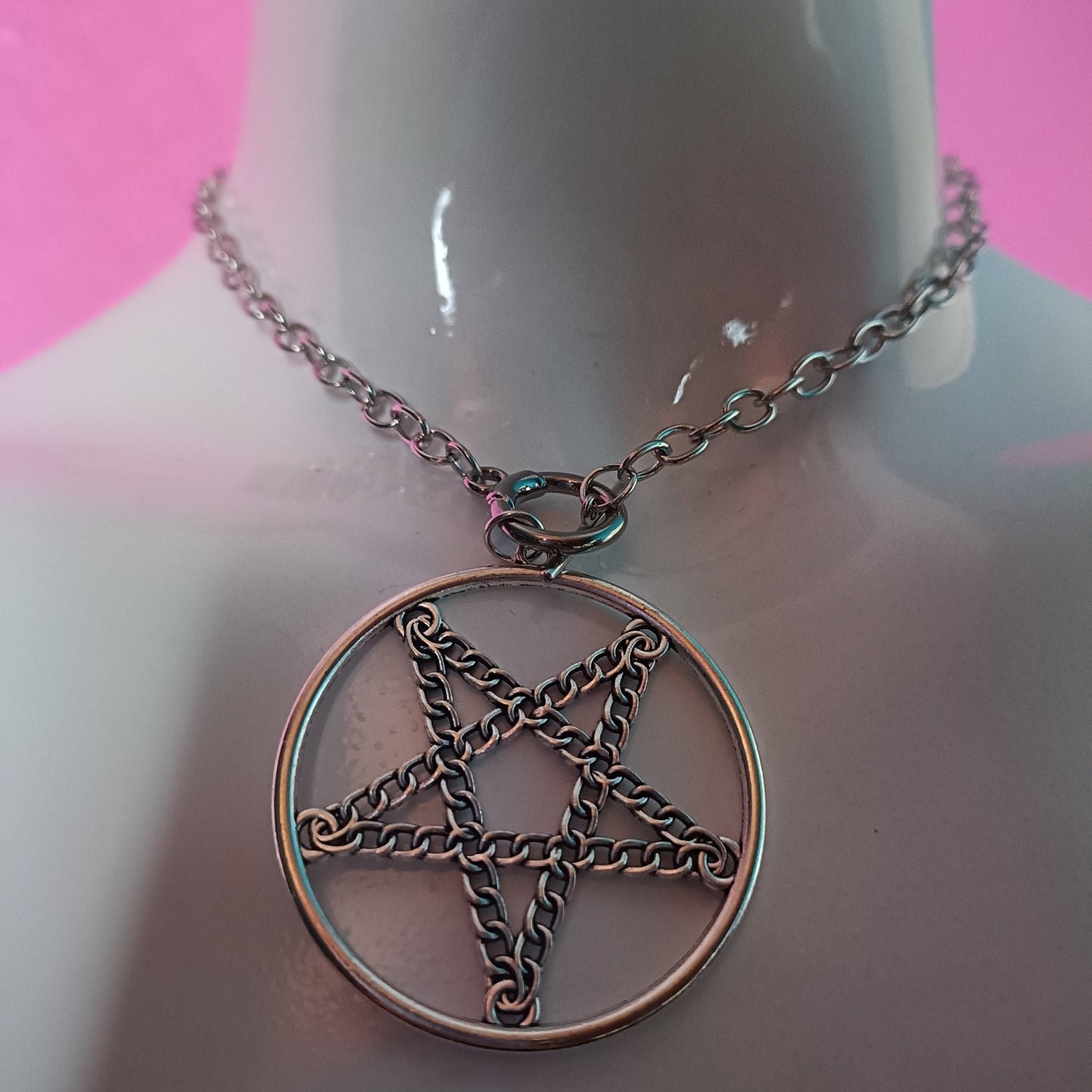 sturdy pentagram chain necklace, chains are securely attached to create an inverted pentagram inside the hoop
