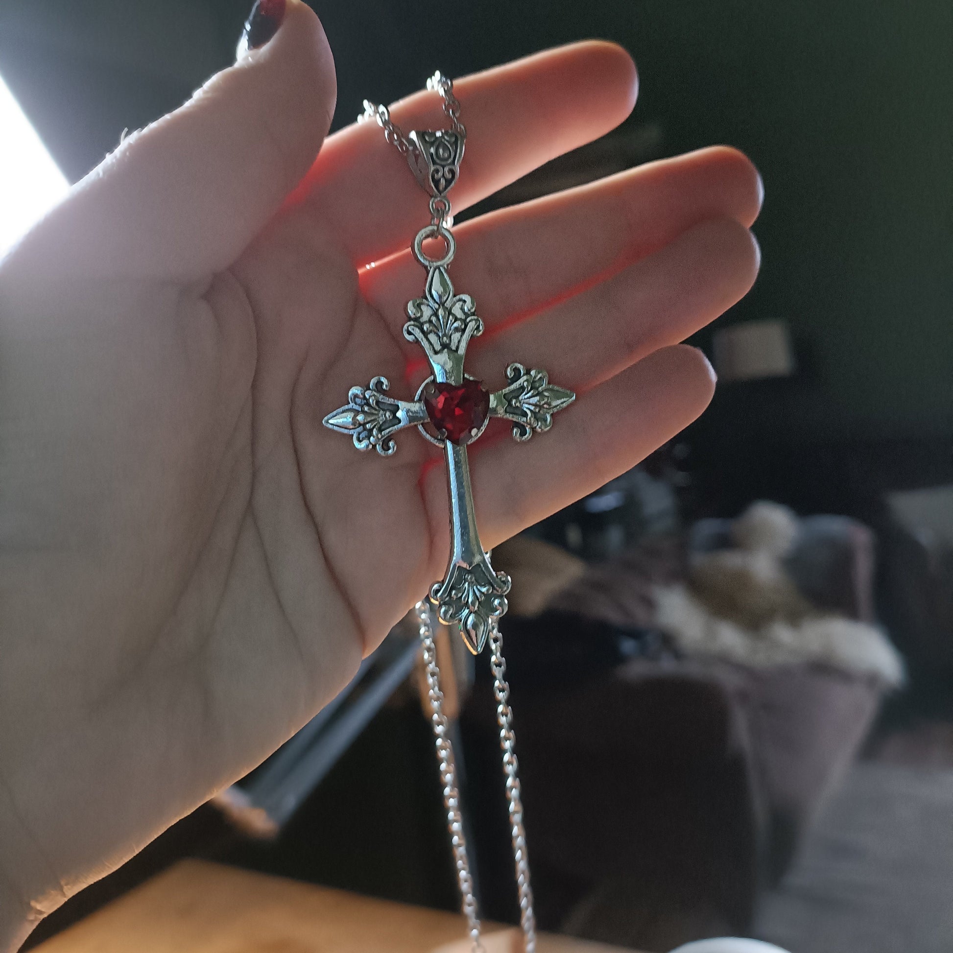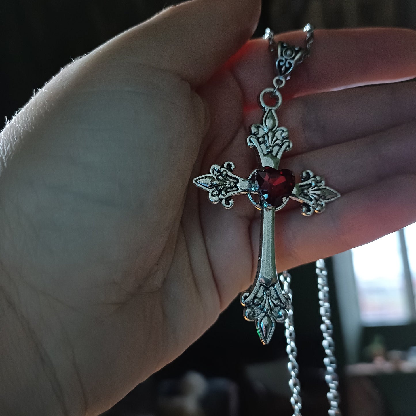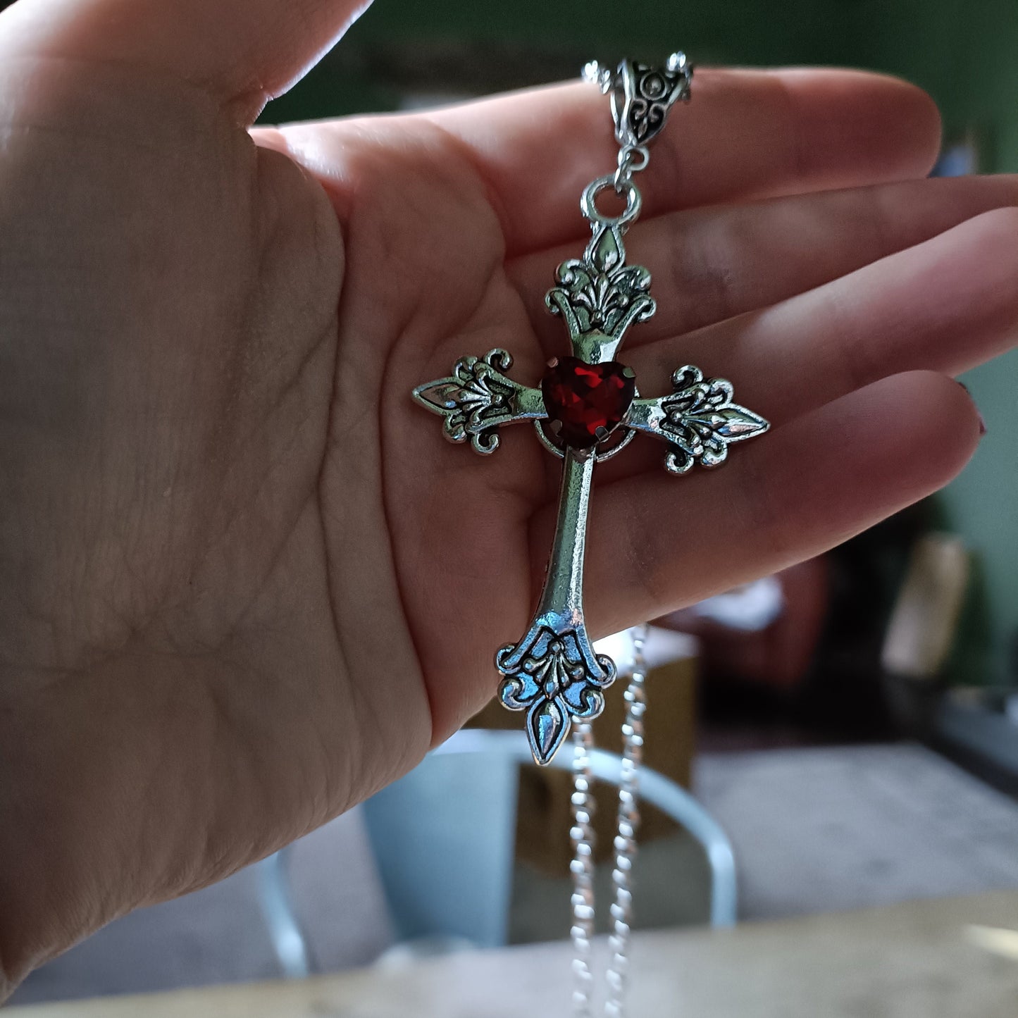 Silver crucifix with a faceted heart gem