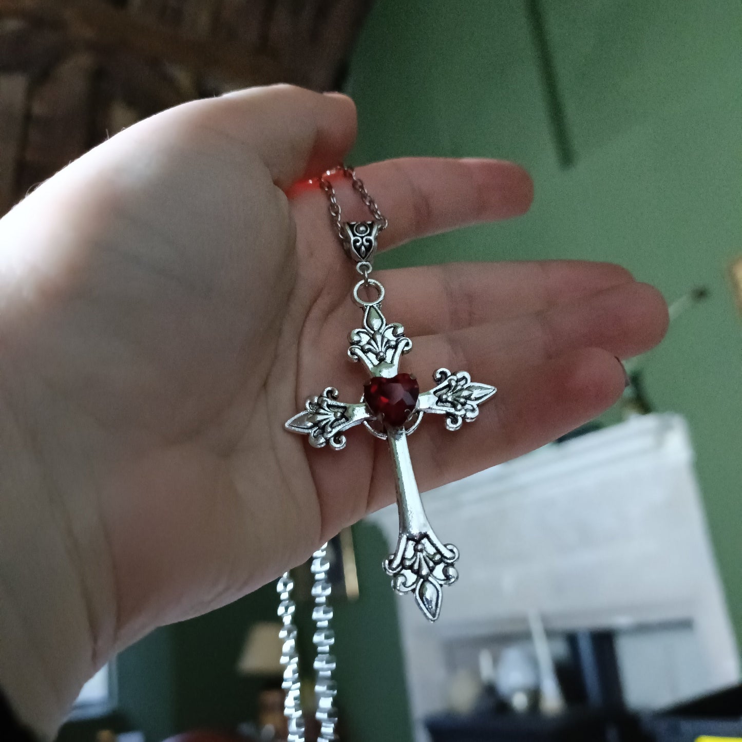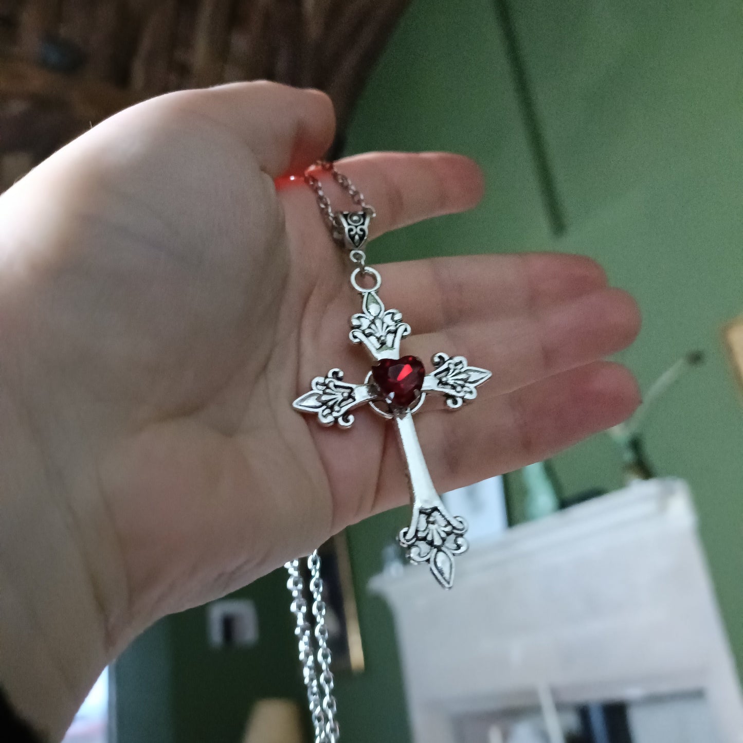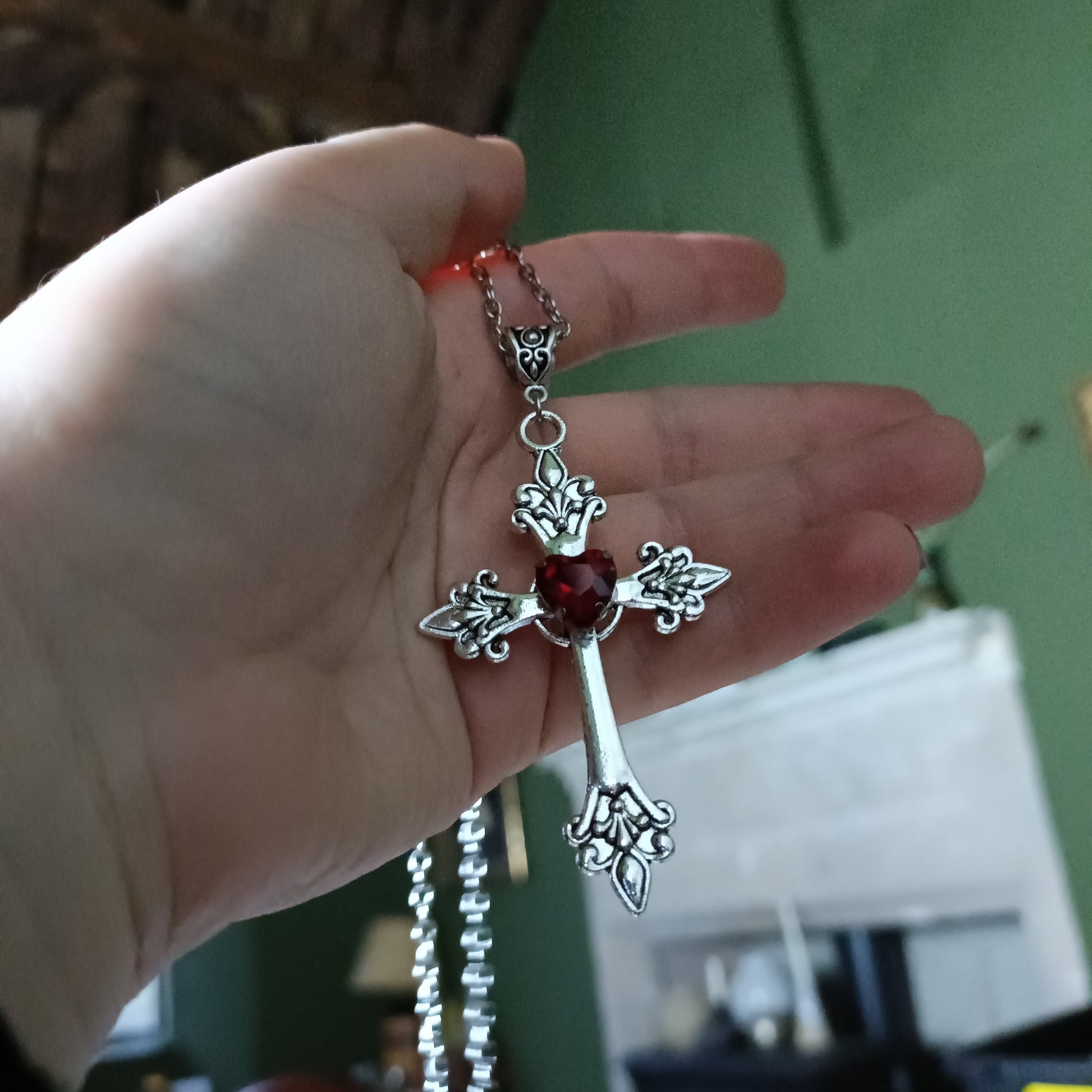 Silver crucifix with a faceted heart gem